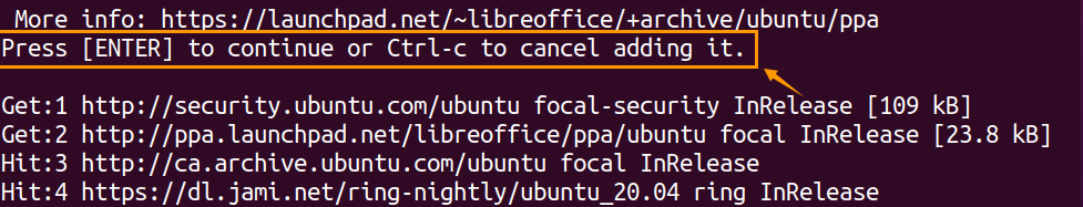 Press ‘Enter’ to continue adding the LibreOffice PPA repository.