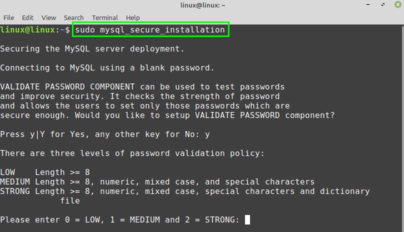 During the execution of the mysql_secure_installation script, you will be displayed various prompts. First, you will see three levels of a password validation policy. You are supposed to press ‘y’ to set up a password. Further, select the password level by entering the respective numeric digit.