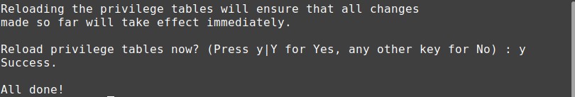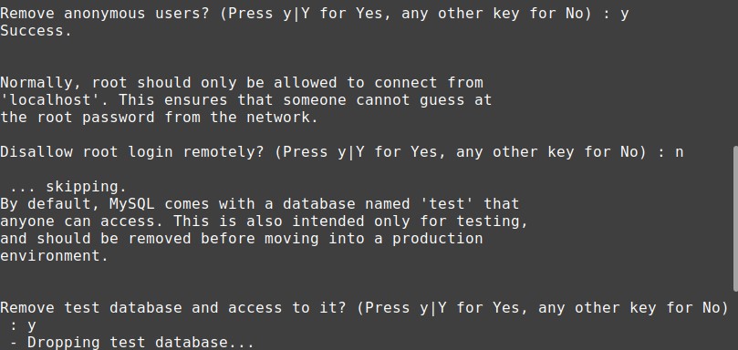 Additionally, you will be prompted to remove the anonymous users, test databases, and reload the privileges table. Press’ y or n’ according to your choice, and the configuration will be performed successfully.