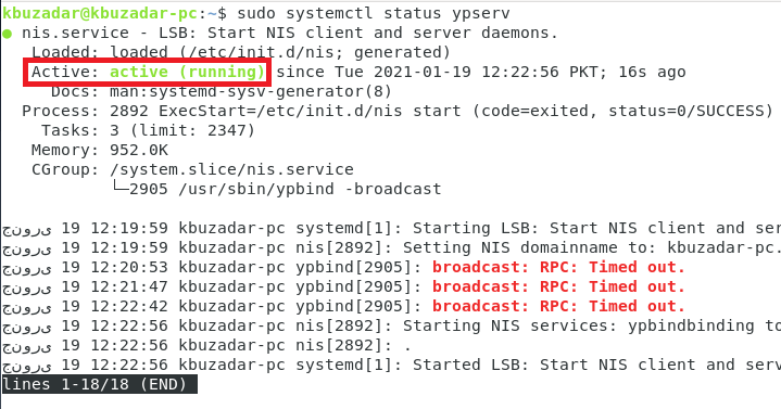 Now, we will check whether the “ypserv” service has been successfully started or not by running the command shown below: