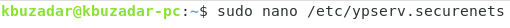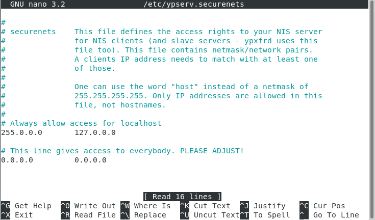 Now, we will set up the IP range to allow access to our NIS server. For that, we will access the /etc/ypserv.securenets file with the following command: