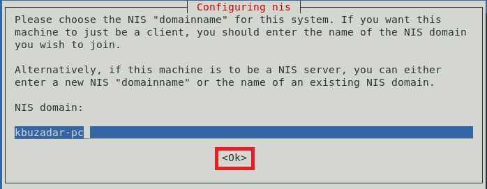During the NIS server’s installation, you will be asked to set up the domain name for it. You can have any name of your choice, or you can either go with the default one and press the Enter key as we did.