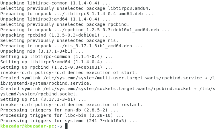 After setting up the domain name for your NIS server, you will notice that the installation will finish within a few seconds while displaying the messages shown in the image below on the terminal: