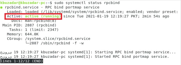 Now, we will check whether the “rpcbind” service has been successfully started or not by running the following command: