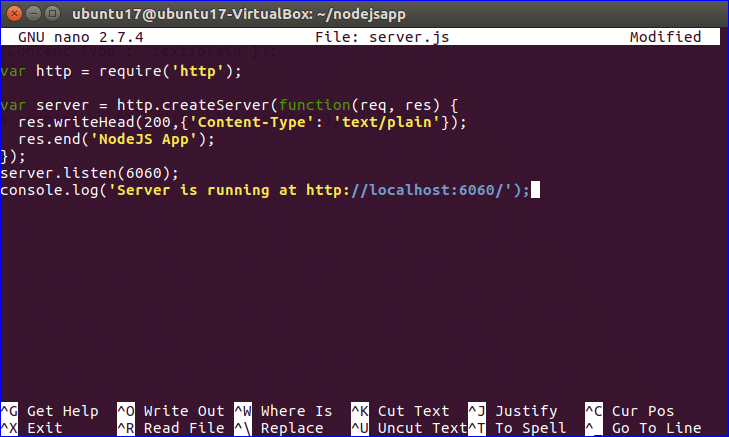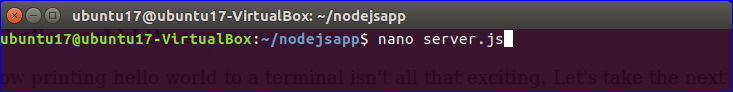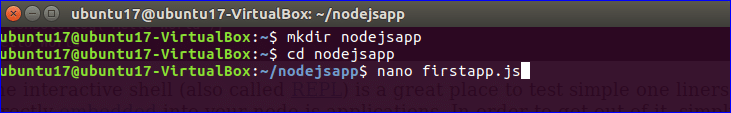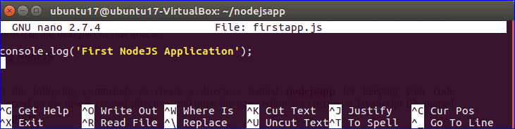 Run the following commands to create a directory named nodejsapp for keeping your code organized, go to the newly created directory and open the nano editor for creating a JavaScript file named firstapp.js.