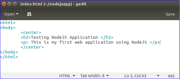 At first, create a very simple html file named index.html using Text Editor with the following code and save it in the nodejsapp directory which is created previously.