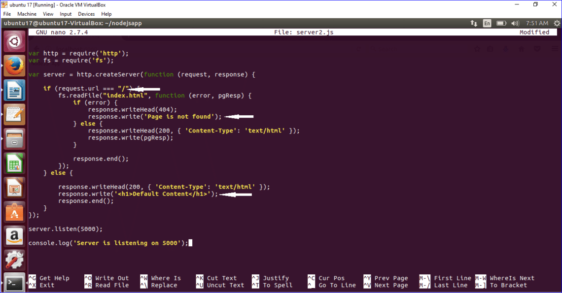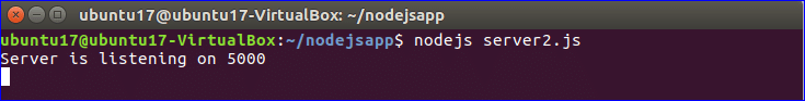 Now, create another JavaScript file named server2.js with the following code to view index.html file, after creating web server connection. Here, fs module is used to read the index.html file. Three types of outputs can be generated based on the code. If the connection establishes properly and index.html file exists then it will load the content of index.html file in the browser. If the connection establishes but index.html file does not exist on the current location then ‘Page is not found’ message will print. If the connection establishes and index.html file also exists but requested url is not correct then ‘Default content’ text will display as by default content. Port number 5000 is set as listening port here. So when web server connection establishes successfully then the message ‘Server is listening on 5000’ will show in the console.