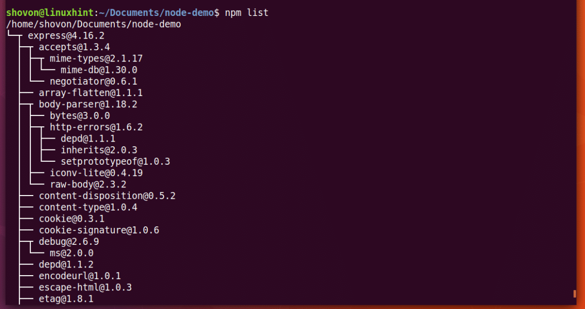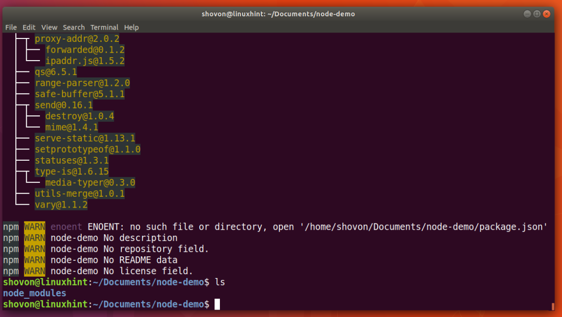 ‘express’ module should be installed and it should be stored in the ‘node_modules’ directory as shown in the screenshot below. When you install it locally, this subdirectory is created.