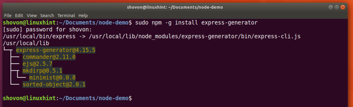 You can install a Node.js module globally or locally. The difference is that, global node modules can be accessed like any other commands, but it’s not the case for locally installed modules. Soon you will see the difference.