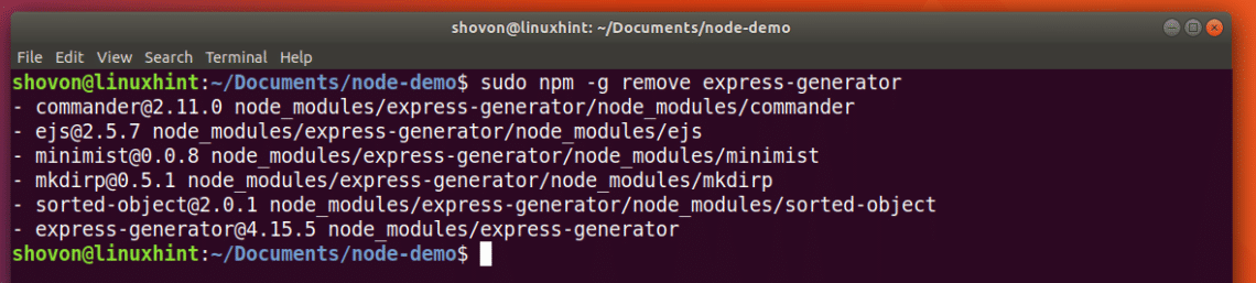 To remove ‘express-generator’ global Node.js module, you can run the following command: