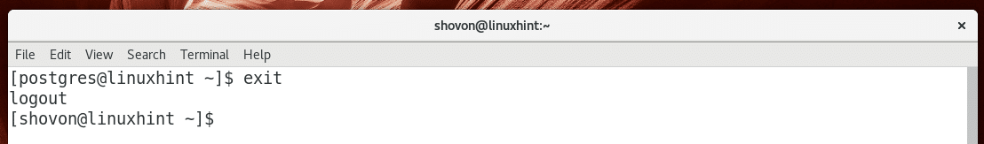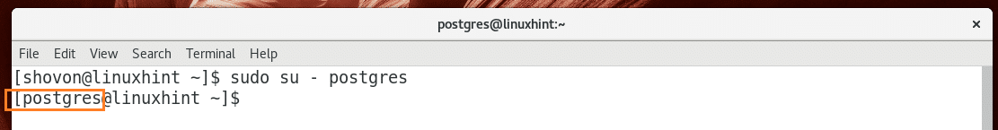 You’re logged in as postgres user as you can see from the marked section of the screenshot below.