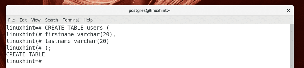 Let’s say you want to create a database linuxhint. You can run the following command to create linuxhint database: