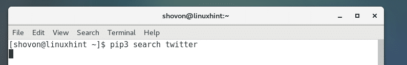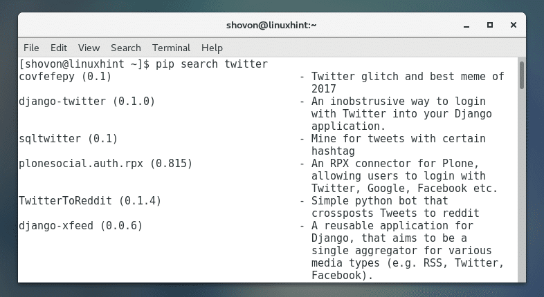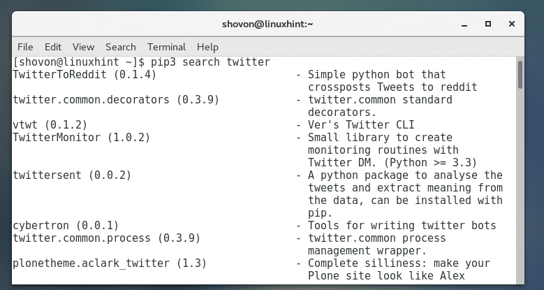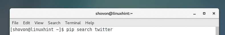 You can search for a python package using PIP. Let’s say you want to search Python API for ‘twitter’. You can do so by running the following command: