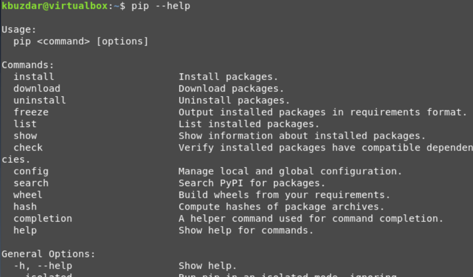 That’s all about the basic commands of the pip tool. To explore more commands and options about pip, run the following command on the terminal: