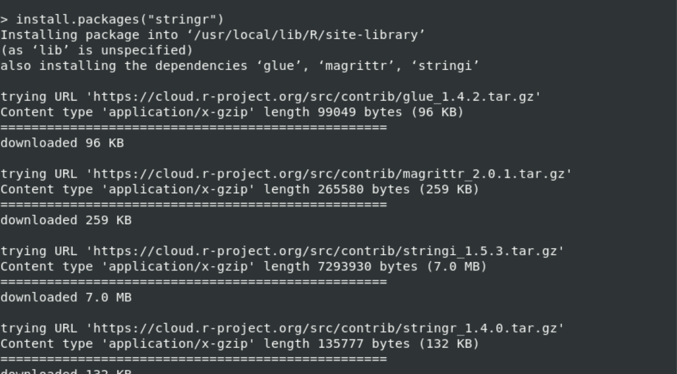 Installation of the ‘Stringr’ package will complete in a few seconds. After that, you will load the relevant library by using the following command: