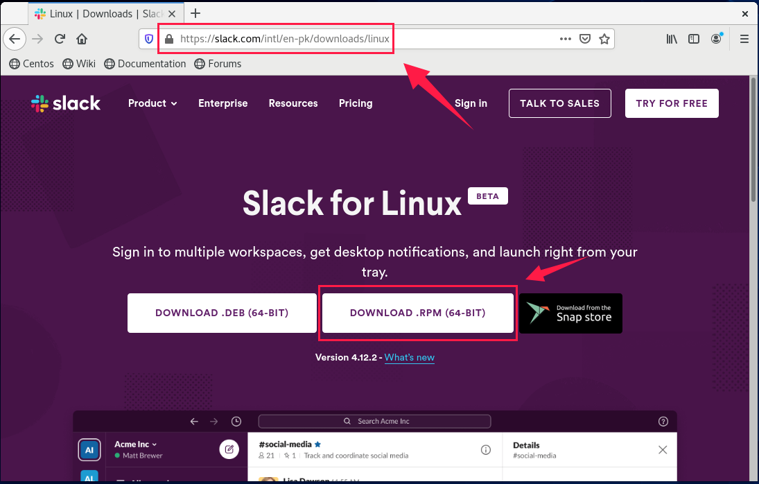 To install Slack on CentOS 8, we need to download Slack’s RPM file for CentOS 8 by visiting Slack’s official website. Visit the link given below: