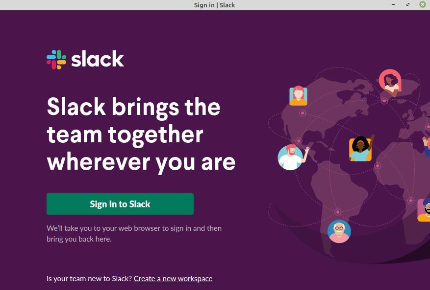 Click on the ‘Slack’ application icon to open it. Sign In to Slack if you have an existing account, otherwise, create a new account by clicking on ‘Create a new workspace’.