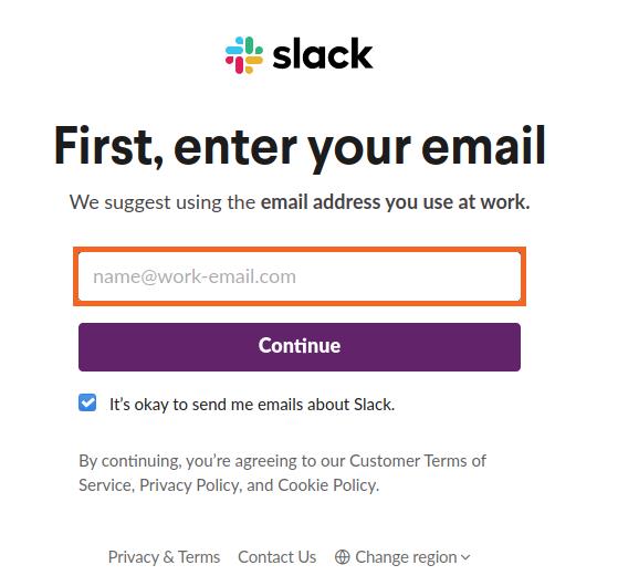 If you intend to create a new account, the Slack Sign Up form will be opened in your default web browser. Enter the email in the given field and click Continue.