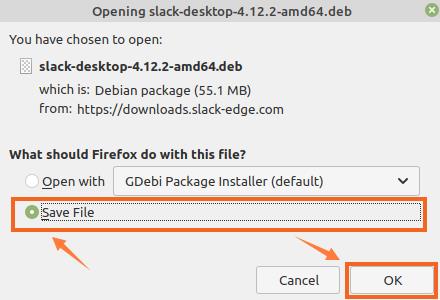 Next, choose the ‘Save File’ and click ‘OK’. The .deb file will then be downloaded and stored in the ‘Downloads’ directory.