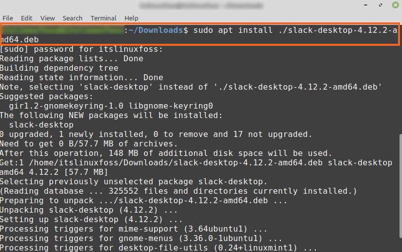 The output shows that Slack 4.12.2 is installed on my Linux Mint 20.