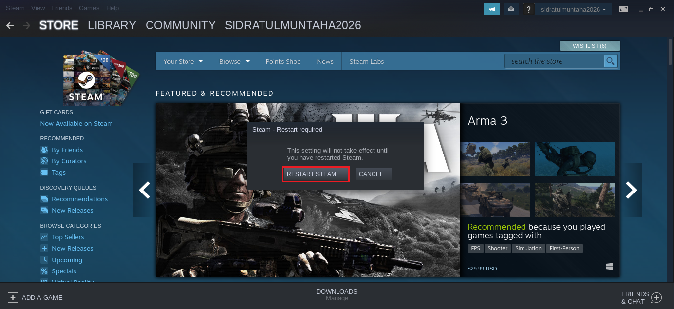 Steam will prompt for restarting the client. Select “RESTART STEAM” to take the changes into effect.