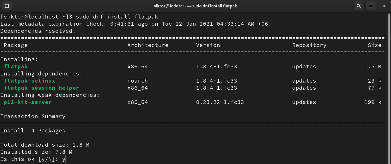 The flatpak package manager comes pre-installed with Fedora. So, there’s no need to install it again manually. However, if it’s missing, then run the following command to install it quickly.