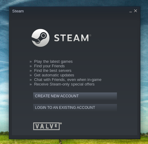 Steam is ready to go! Assuming you already have a Steam account, select “LOGIN TO AN EXISTING ACCOUNT”. If there’s no Steam account, then click “CREATE NEW ACCOUNT” and follow the instructions to create a new one.