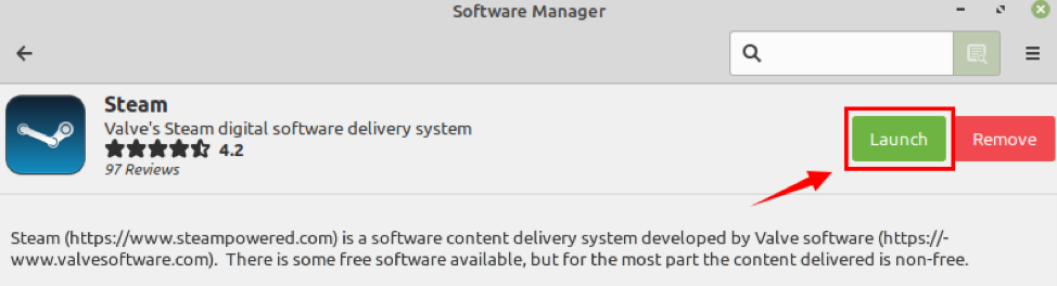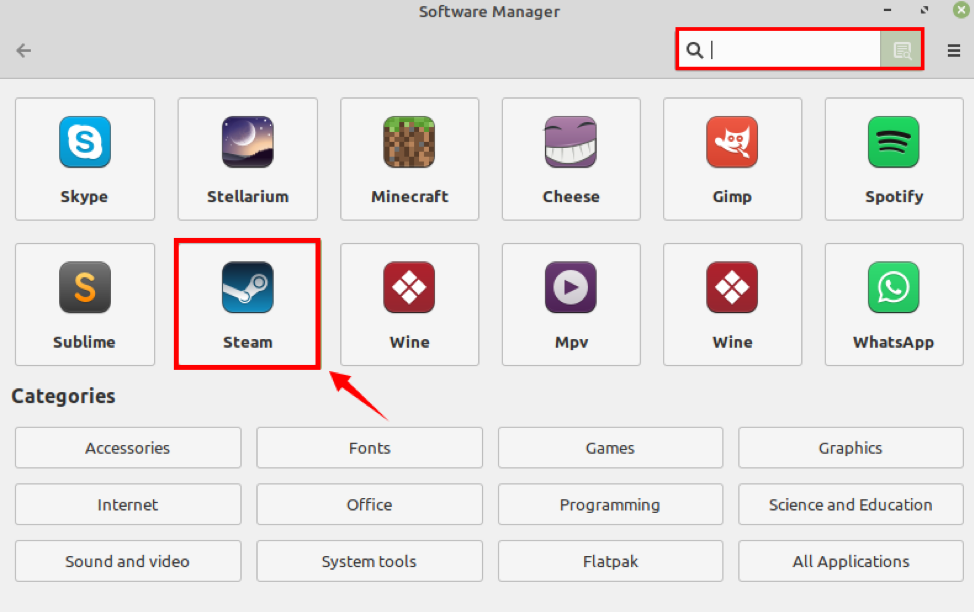 Open the Software Manager utility, you will find the Steam application on the dashboard because it is very popular. In case, steam is not available on the Dashboard screen, then write Steam in the search bar.