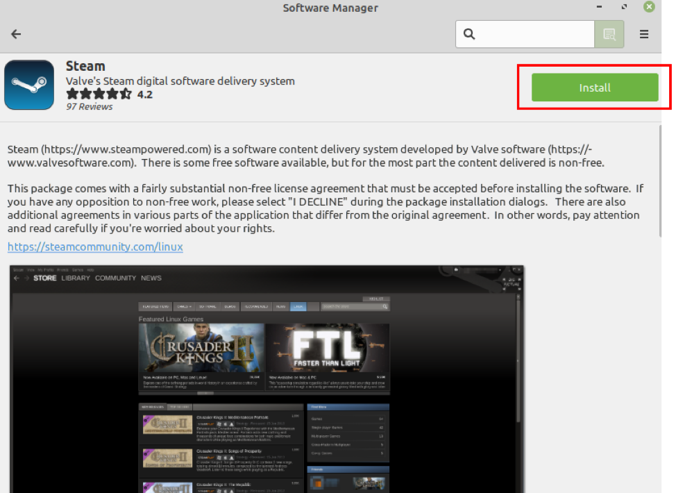 It can be installed on Linux Mint 20 from the Software Manager utility, from the terminal using the apt command, and from the steam official website.
