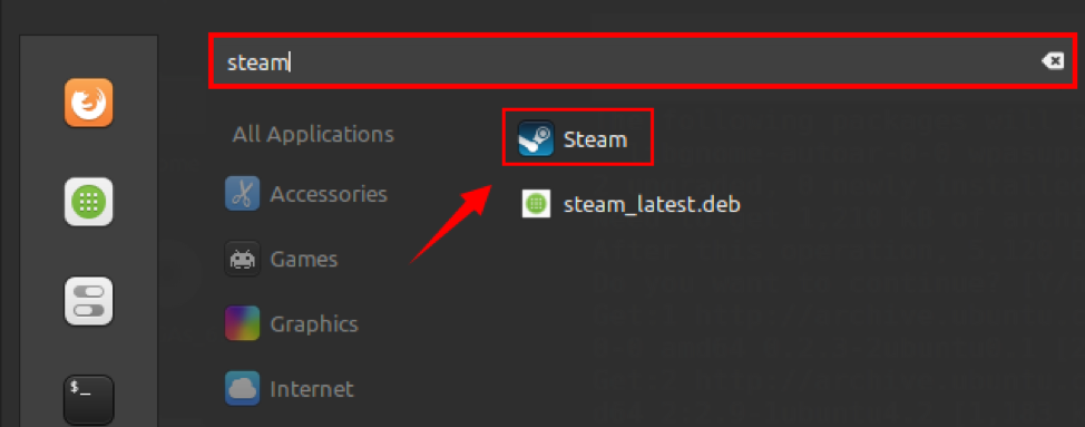 Once you have installed Steam on Linux Mint 20 using any of the methods, open the Application Menu and search for Steam.