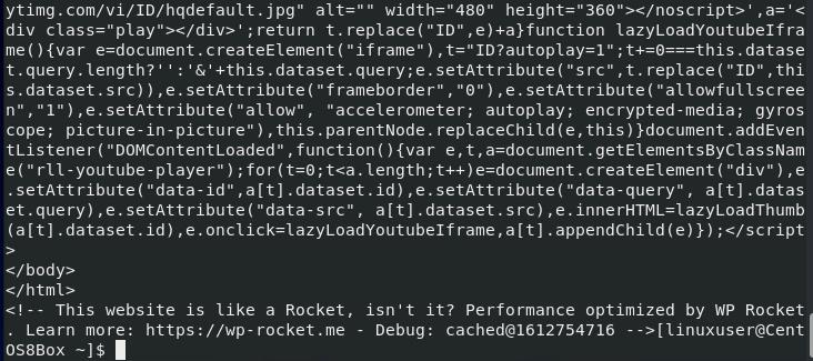 This article showed you how to install Curl on CentOS 8 and start using it. This post contains the installation process of Curl, as well as its usage, such as getting the source code of a website and downloading a file from a website. The functionality of the Curl command does not stop here, and it provides a lot of other features to users. You can read the manual page on the official Curl website to learn more.