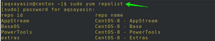 First of all, you will have to check whether your Centos 8 has an epel repository installed and enabled or not. For this purpose, execute the following command: