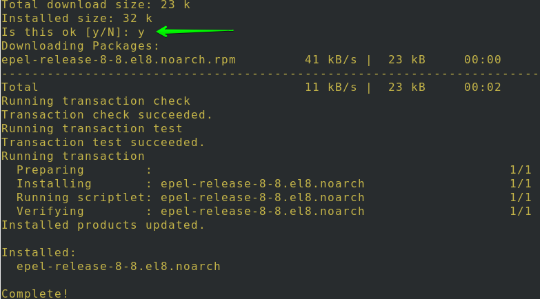 After that, you will be asked to confirm your action by typing “y”, and then hit Enter to continue installation. As a result, the epel repository will be installed in your system.