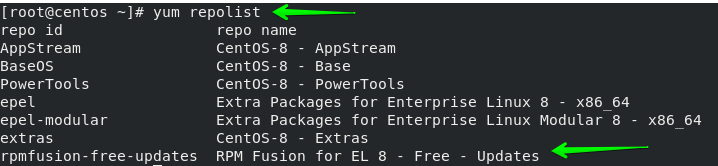 Using the repolist command, you can see that the RPM Fusion repository is now installed in the system.