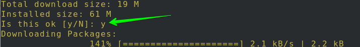 You will be asked more than one time to confirm your action. Type “y” and then tap Enter to continue as shown. You can see that the FFmpeg tool will be installed in your system.