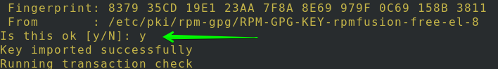 After that, you will be asked to confirm your action. Type “y” and then tap Enter to continue as displayed. You can see that the RPM Fusion repository will be installed in your system. Remember to use YUM or DNF only.