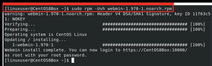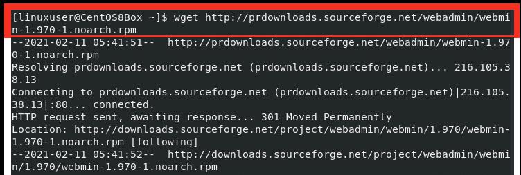 Or, download the RPM package of Webmin by issuing the following command in the CentOS 8 terminal.