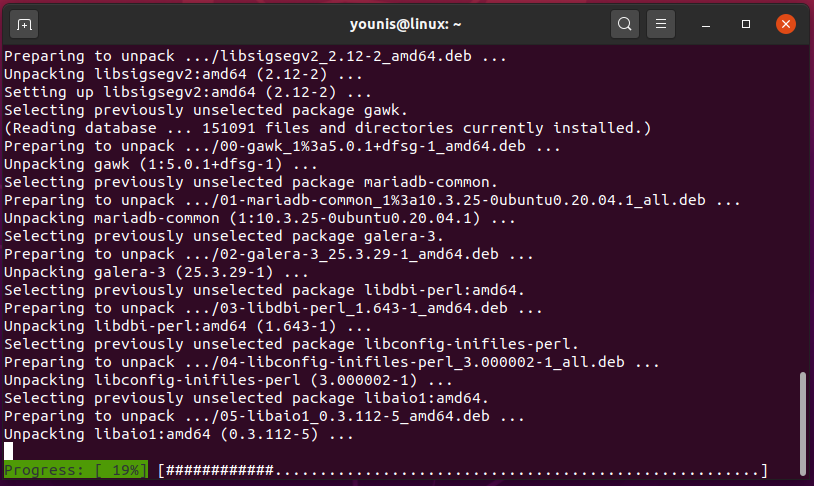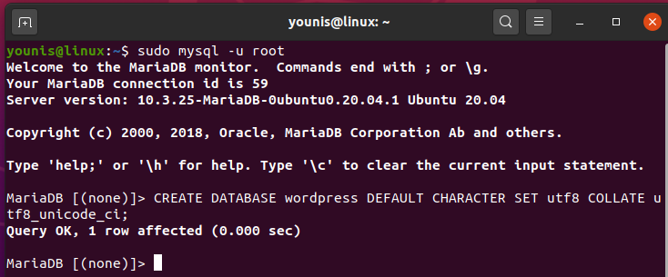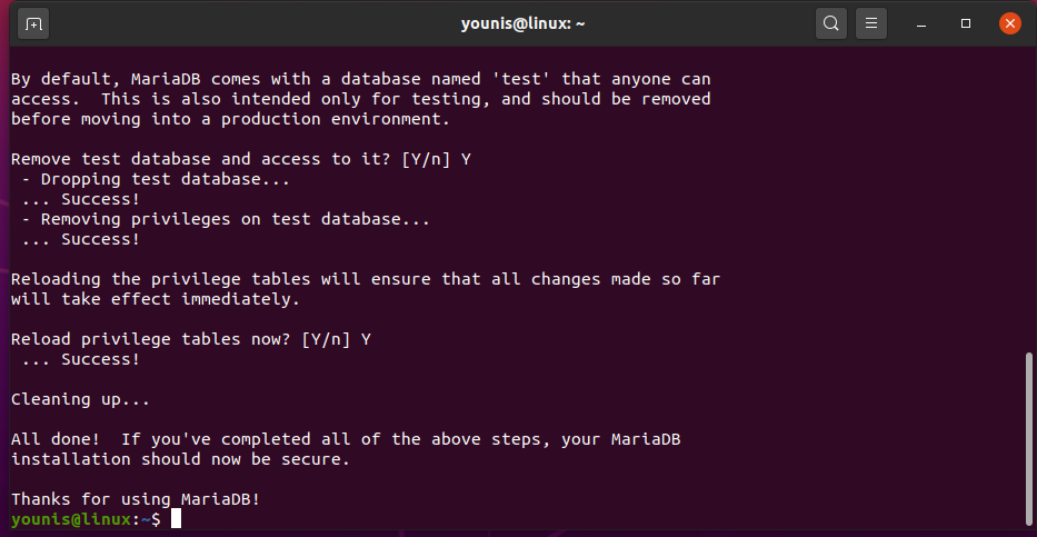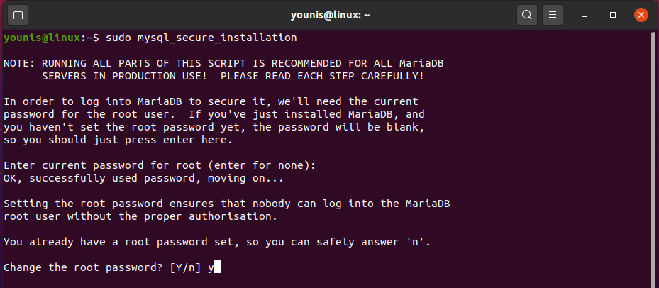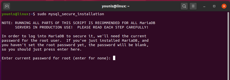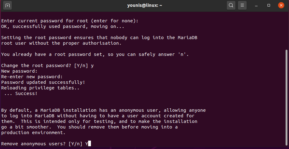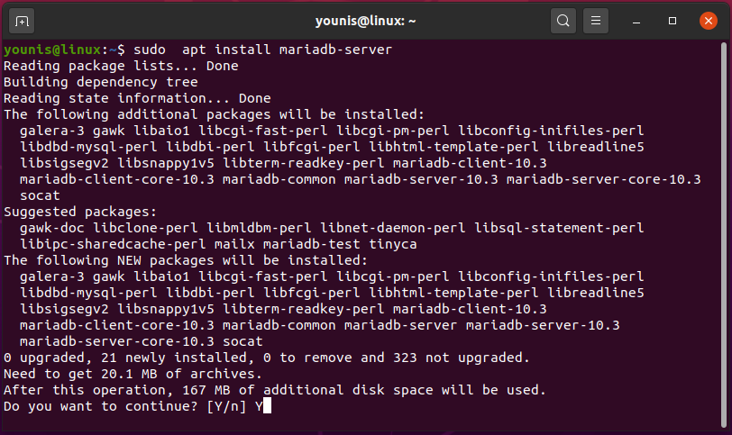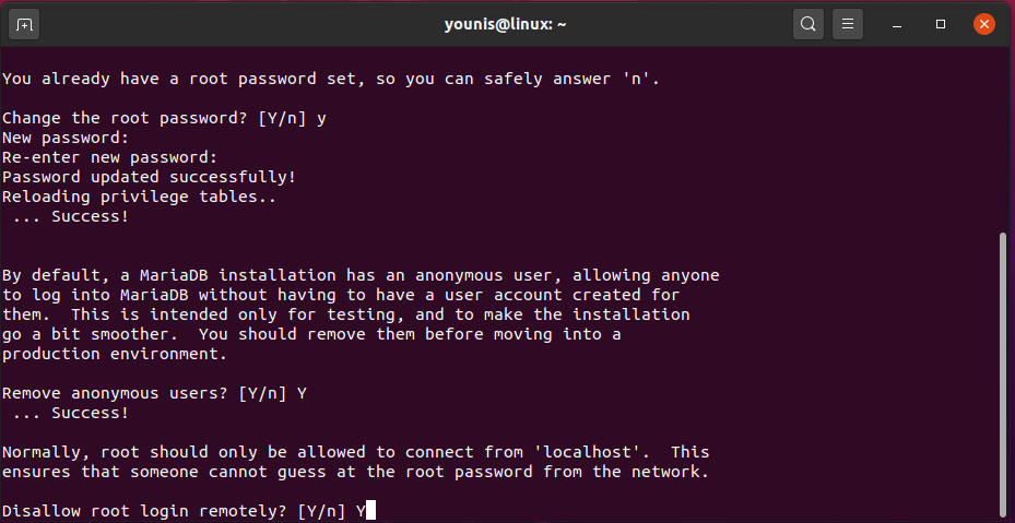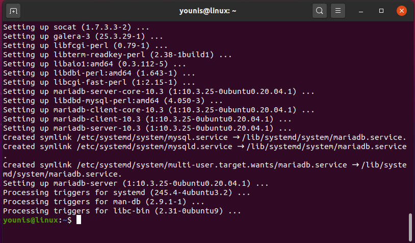Use the following commands to install MariaDB in Ubuntu. Both MariaDB and its client version will be downloaded once you enter the first command. The second command allows for the initiation of the MySQL service, and the third command enables the service. The last commands ensure that the installation is stable. You will be prompted with some questions; be sure to give the database server a root password so that you can use the key for the questions later.