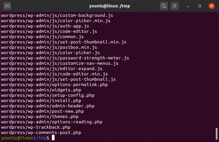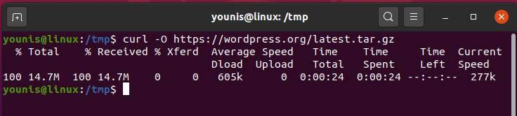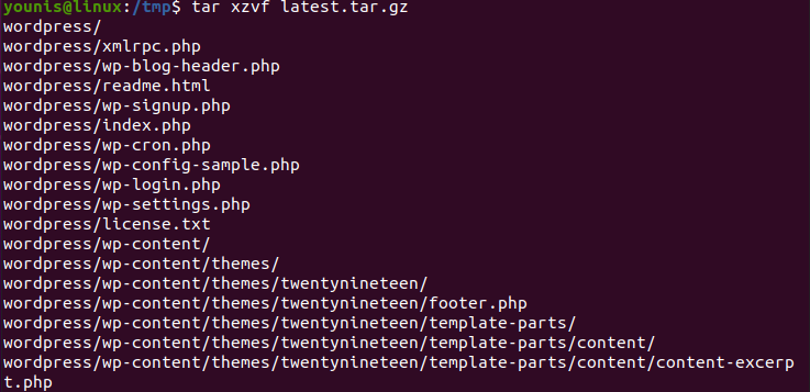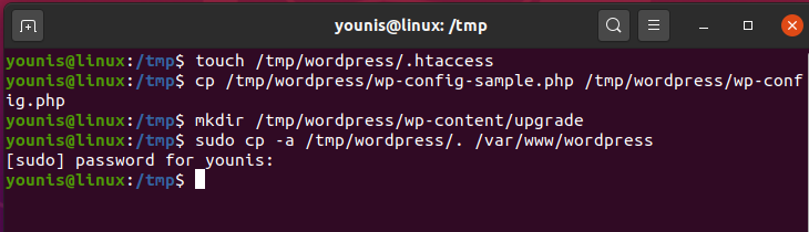 At this stage, WordPress is installed. Use the following shell commands to do so. The first command sends the user to a folder that is made temporarily and whose job is to keep the WordPress download files. The second command installs the files. The third command extracts the installed version, and the fourth command replicates the config file. Finally, the fifth command adds a new folder.