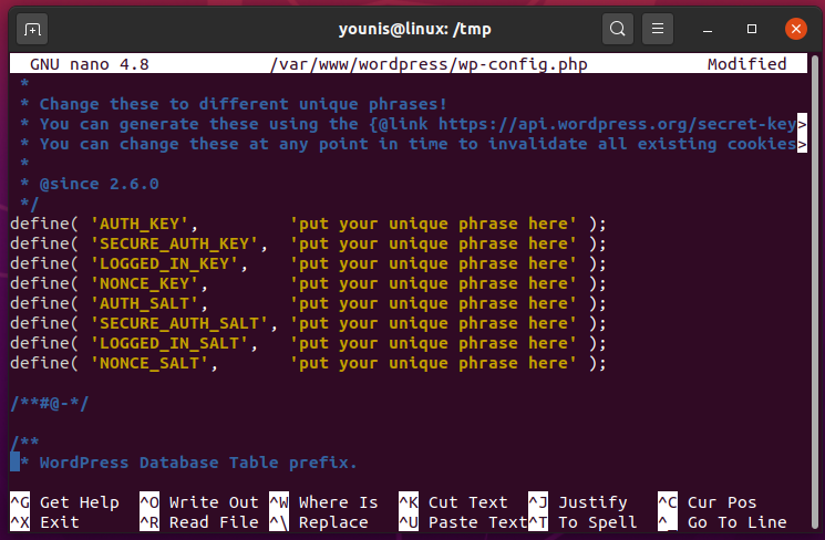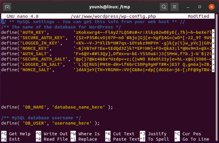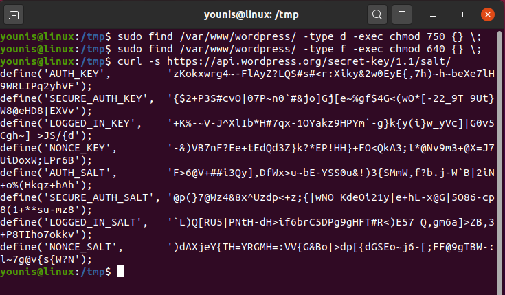 Next, you will configure the settings. The commands you use here will tell you how to configure the wp-config.php. The first command generates salt values to secure the WordPress installation. The second command opens an actual wp-cnfig.php file.