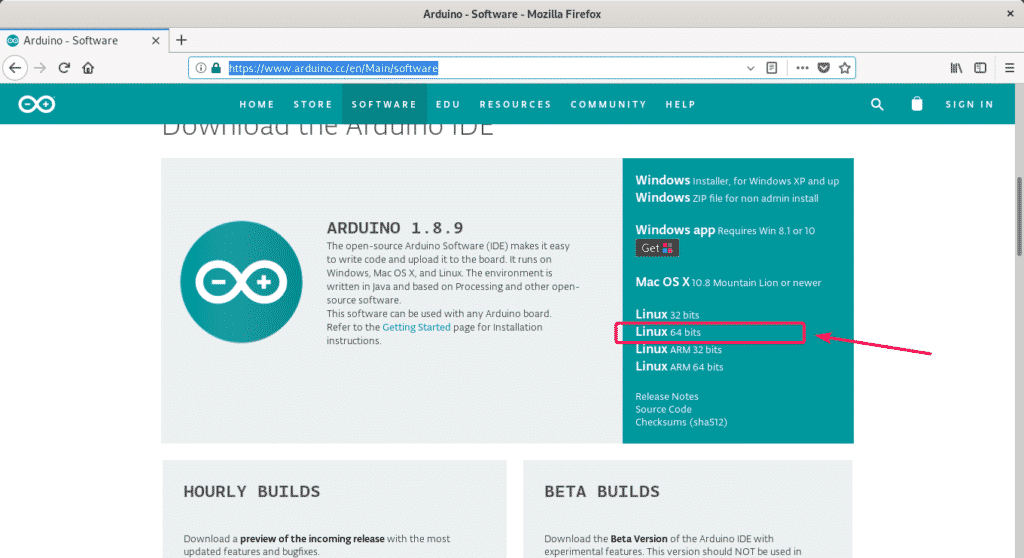 First, visit the official Arduino IDE page from your favorite web browser. Now, scroll down a little bit and click on Linux 64 bits link as marked in the screenshot below.