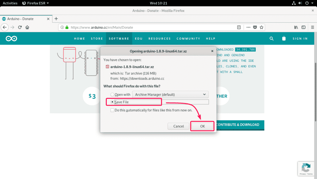 Your browser should prompt you to save the Arduino IDE archive. Select Save File and click on OK.