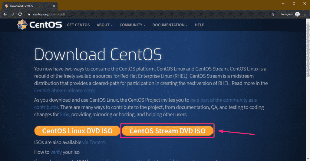 First, visit the official website of CentOS. Once the page loads, click on CentOS Stream DVD ISO as marked in the screenshot below.