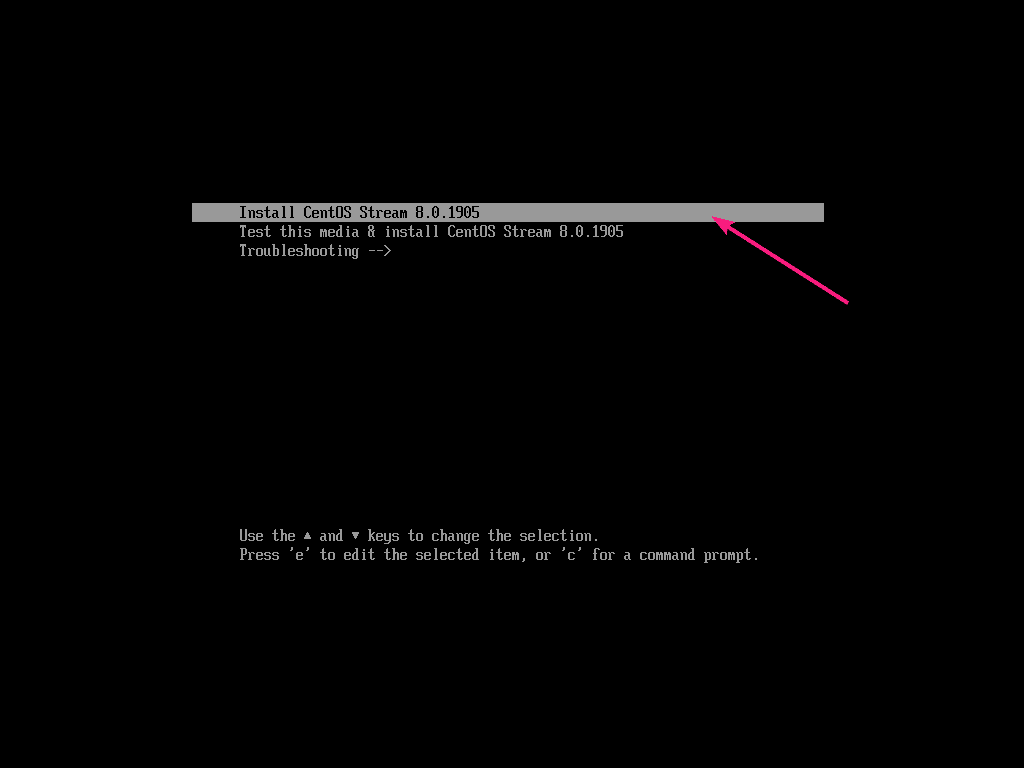 You should see the following GRUB menu. Select Install CentOS Stream 8.0.1905 and press <Enter>.