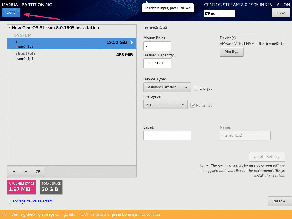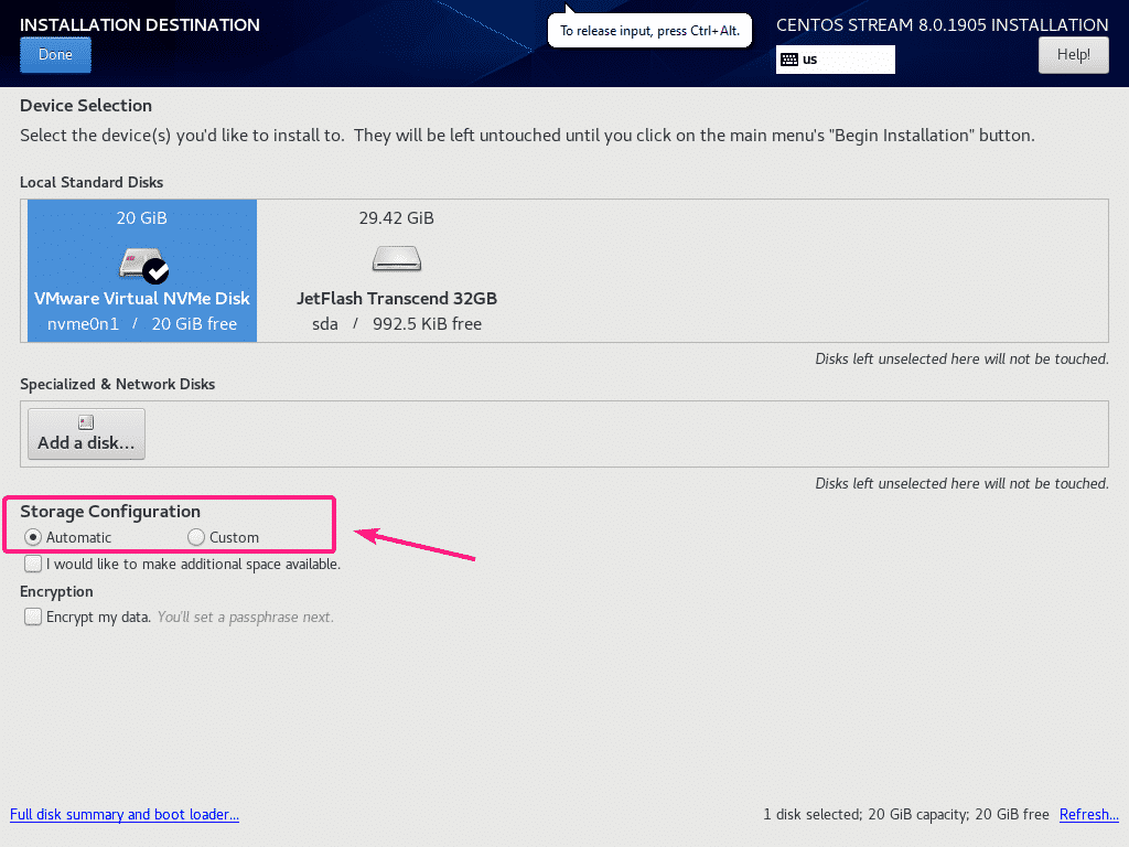 For, automatic partitioning, select Automatic and click on Done. For manual partitioning, select Custom and click on Done.