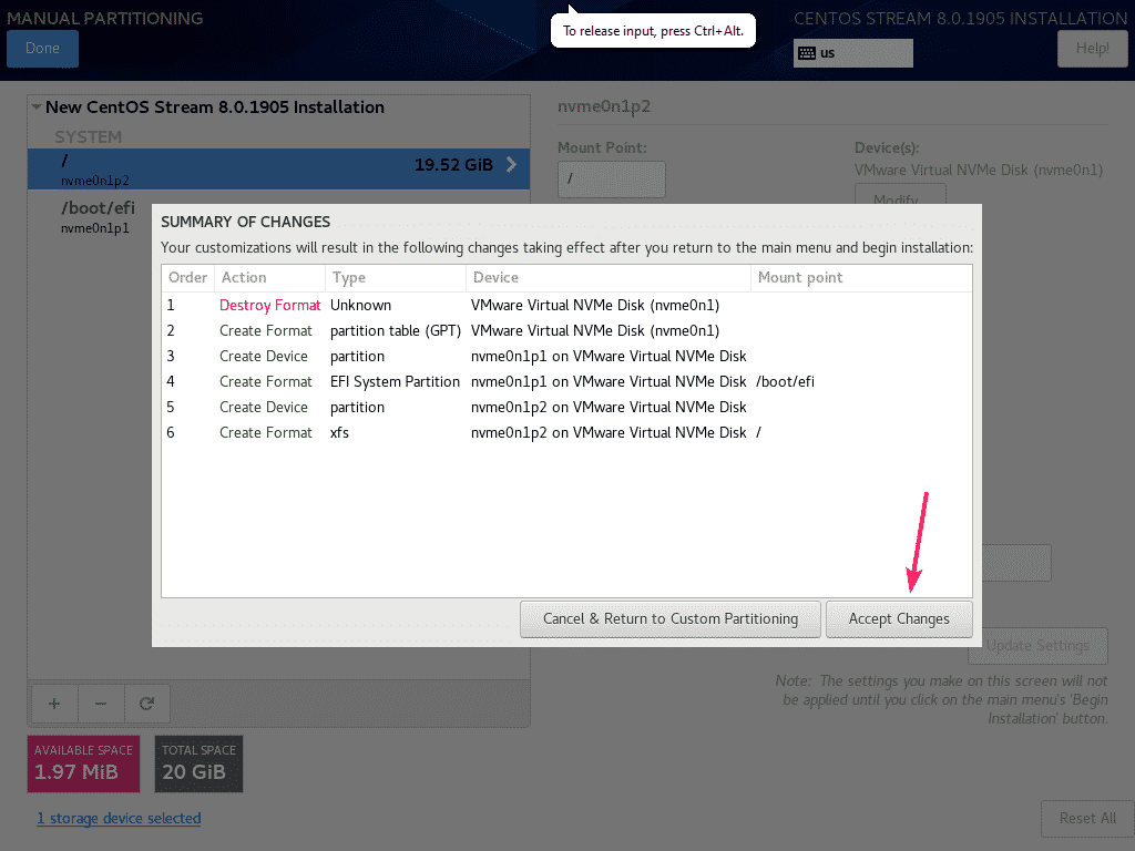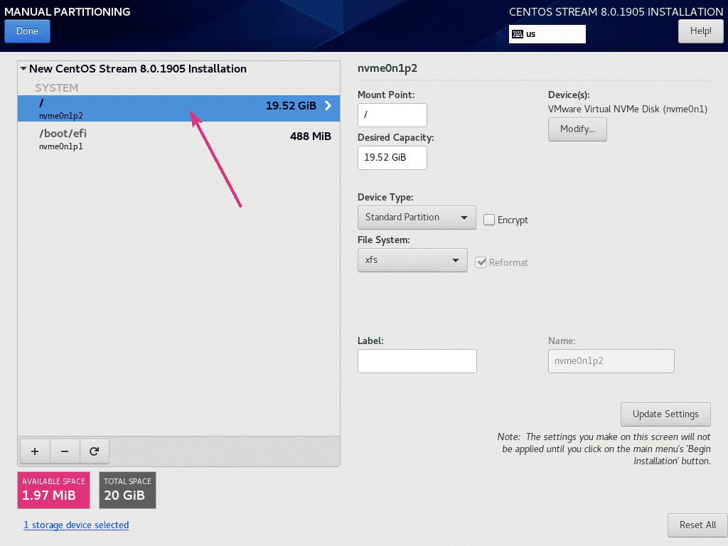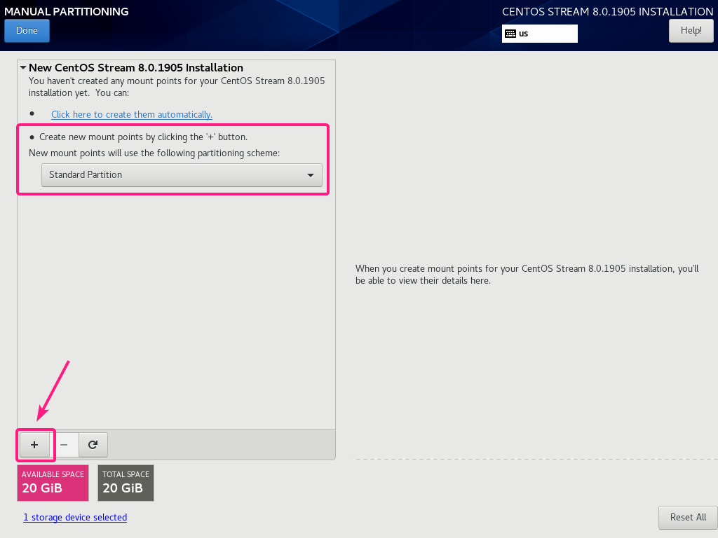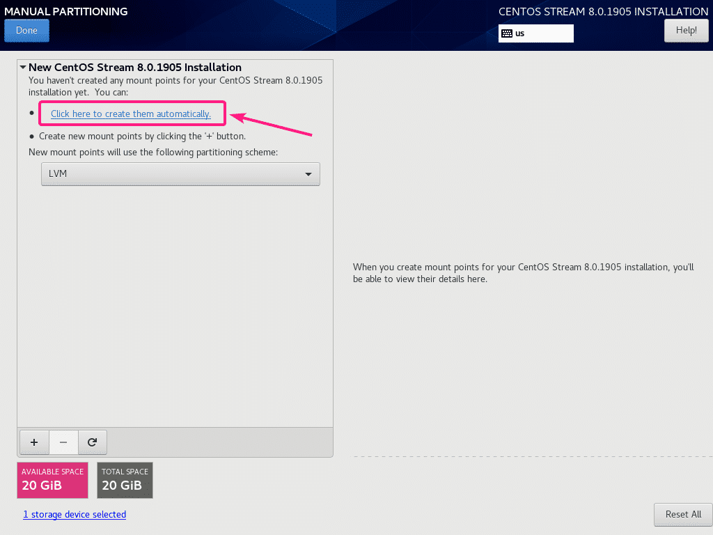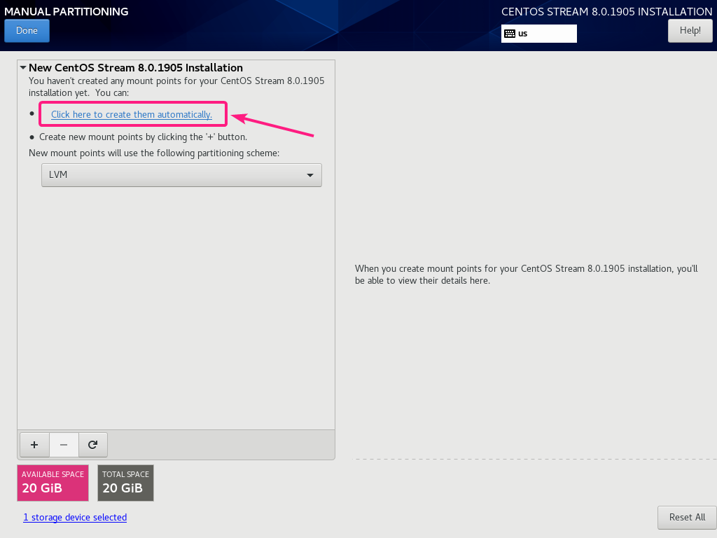 You can either let CentOS 8 Stream to automatically partition the hard drive or SSD. Or, you can manually partition it yourself.