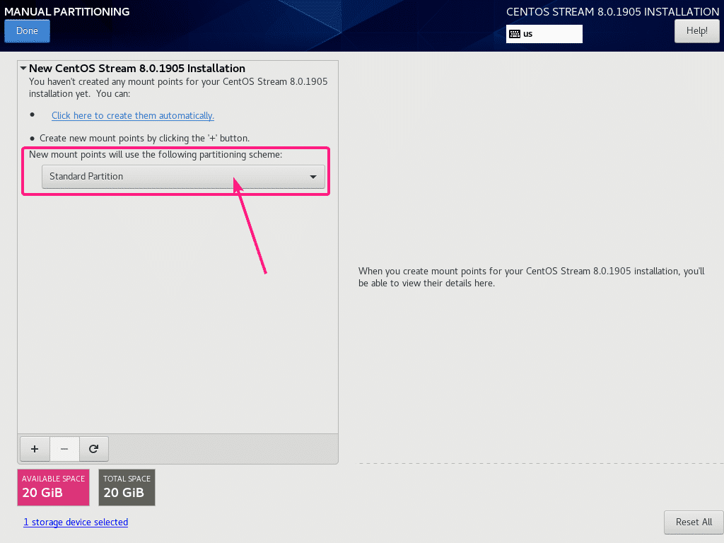 On CentOS 8 Stream, 3 different partitioning schemes Standard Partition, LVM, and LVM Thin Provisioning are available. The default is LVM. You can change to a different partitioning scheme from the partitioning scheme dropdown menu if you want.