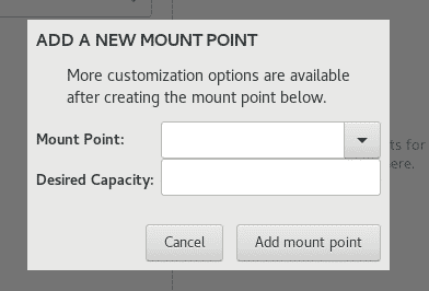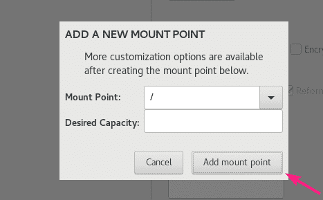The same way, create another partition. This will be the root partition. So, set the Mount Point to / and set the Desired Capacity depending on your need. If you want to use up all the available free space, then leave the Desired Capacity field empty. Once you’re done, click on Add mount point.