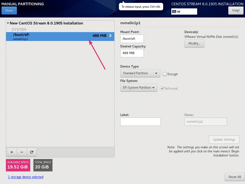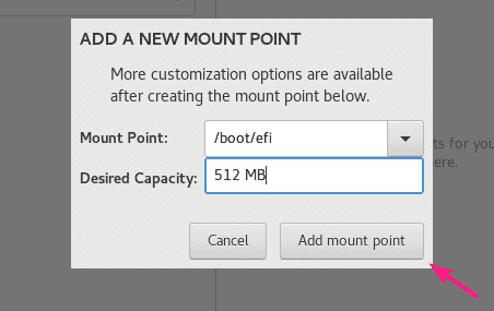 For EFI System Partition, set the Mount Point to /boot/efi and Desired Capacity to 512 MB. Once you’re done, click on Add mount point.