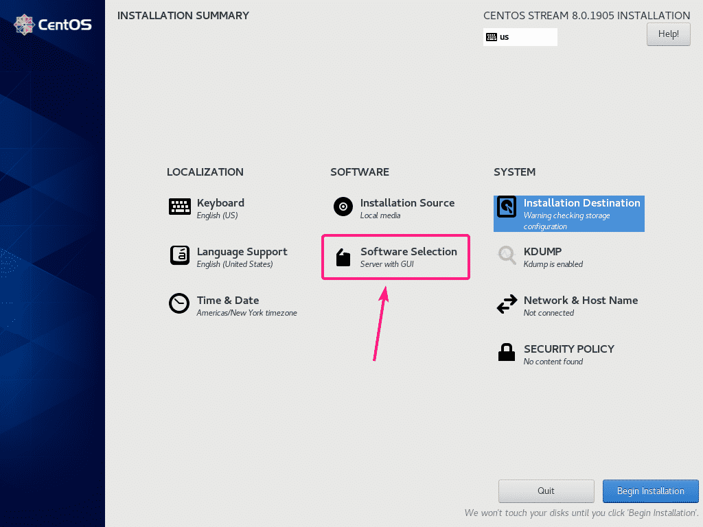 By default, CentOS 8 Stream will install Server with GUI environment. If you want to change that, click on Software Selection.